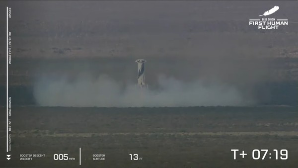 Booster New Shepard kembali ke Bumi setelah mengantarkan kapsul. Semua proses dari lepas landas sampai pendaratan dilakukan secara otonom. |